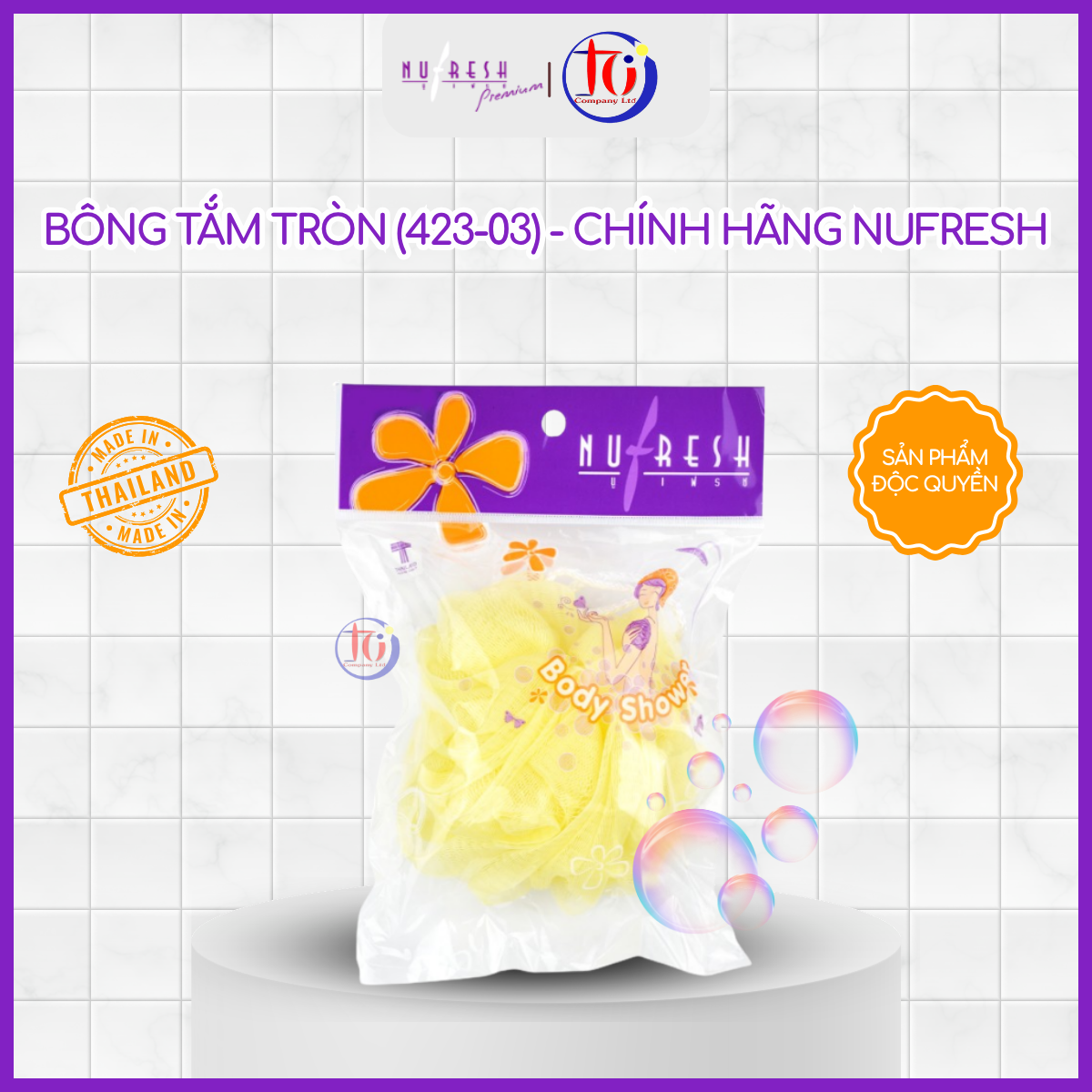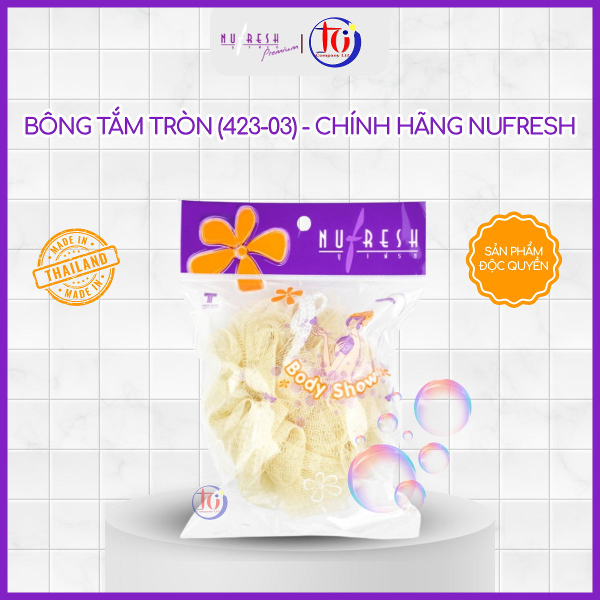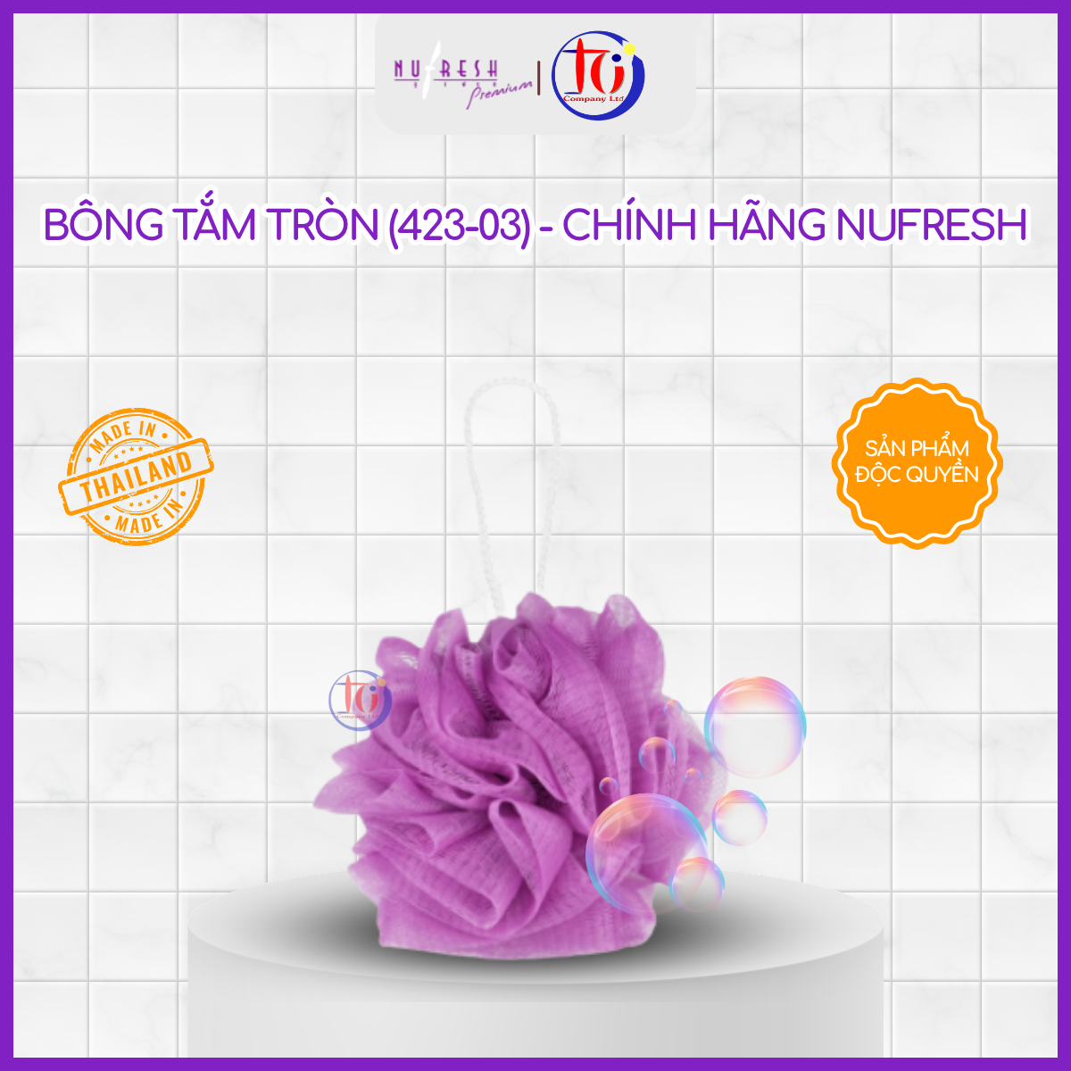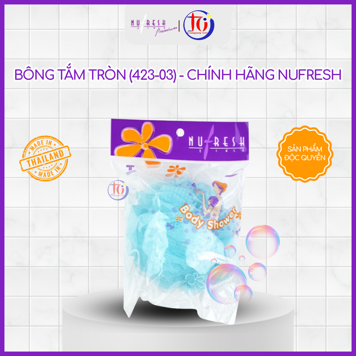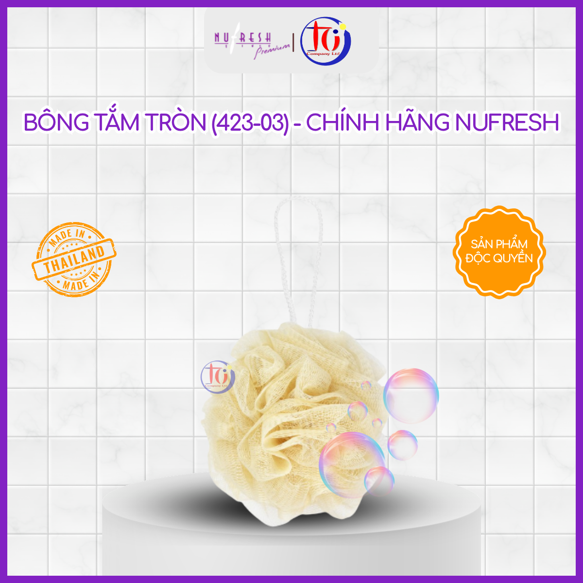 Bông tắm tròn Nufresh được sản xuất tại Thái Lan, thiết kế dạng lưới tròn dày dặn, mềm mại, giúp tạo bọt nhanh và làm sạch da hiệu quả trong mỗi lần tắm.